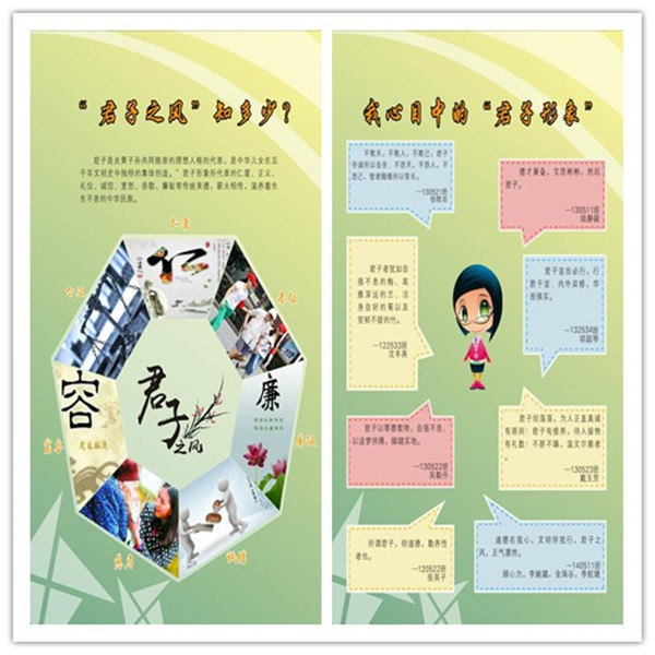 学院遵循大学生心理认知规律,从知、情、意、行角度,结合专业特点科学地对主题教育活动进行顶层设计,通过微信、橱窗、网站等形式营造良好的舆论氛围。如为普及“君子之风”知识,通过微信形式开展了“弘扬‘君子之风’”(中英版)、学者论“君子之风”等线上自主学习活动;通过微信、展板等形式开展了“‘君子之风’知多少”线下宣传普及活动。为深入了解大学生心目中的君子形象及大学生不文明现象,举办了君子品格微语录征集、我是拍客-寻找镜头下的不文明现象等活动,并把优秀作品通过微信、展板等形式进行展示。此外,学院还开展了“君子之风”主题英语角活动、“明礼诚信,立志成才”主题红色悦读季活动,积极引导学生在学习语言的过程中进一步传承和发扬中国优秀传统文化。