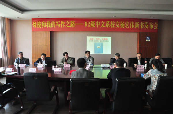 4月25日,文学院联合市文学学会举办92级中文系校友杨宏伟新书发布及赠书仪式,市作家协会、市图书馆、德清县作家协会相关负责人,优秀校友代表和文学院师生参加了活动。
