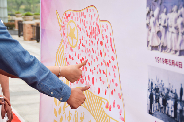 “同学,你好!请问你觉得这次五四活动最吸引你的是什么呢?”“我觉得德清湖畔用手指印围成的团徽图案好像挺新意,我刚刚也去点了个赞,为湖师院的团员青年点赞。”记者来到东校区德清湖畔,看到了这样的场景:经过喷绘的每一位同学都用手指印下了属于他们自己的印记,为师院点赞,为青春点赞,以此纪念五四青年节。这是我校开展的五四系列活动之一:“我为师院点个赞”,结合当下流行的点赞行为,将虚拟的点赞行动外化为真实的手动点赞,吸引了我校一大批同学的参与。