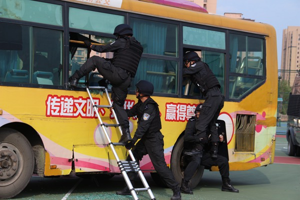 下午四时整,在“呜……呜……”的警笛声中,应急疏散预案演练正式开始。不到15分钟,4500余名参演师生在预警信号、应急疏散人员的引导下,从各宿舍撤离,安全、有序地按照既定路线撤离到了避险场所。随后,公安特警、校卫队员及师生上演了一场逼真的反恐防暴生死之战,为在场师生上了生动一课。