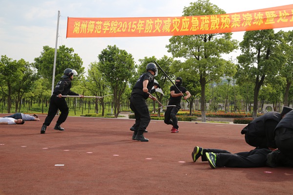 5月13日,学校举办2015年防灾减灾应急疏散预案演练暨处置突发性事件预案演练活动。校党委副书记杨柳出席,湖州市公安局、市卫生局、市地震局、市红十字会、市人防办、市公共交通有限责任公司相关负责人和我校部分师生4000余人参加了演练。校综治领导小组成员、相关职能部门、湖州民防学院负责人、下属学院副书记及消防、派出所负责人观摩了演练。