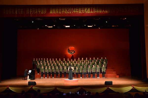 此次2014年度共青团工作表彰暨2015年红五月歌咏会形式丰富多样,布置精巧,值得一提的是湖小狮作为红五月活动的“代言人”活跃在现场的各个角落,工作服、现场布置都以湖小狮为元素,为本次活动增添了更为青春的一笔。青年们用歌声遥寄对峥嵘岁月的追思,用歌声表达对祖国的祝福颂扬,同时也以此热烈迎接学校第三次党代会的召开。