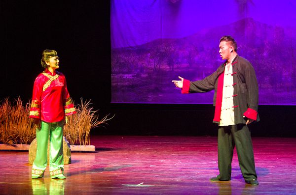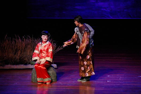 整场演出共分四幕,历时两小时。饰演男主角仇虎的是华东师范大学音乐系博士研究生王志达,作为男中音的他声音沉稳厚实,且戏剧张力十足,既能表现出对杀父仇人滔天的恨意;也可表现出对女主角深情的爱;饰演女主角金子的是华东师范大学青年教师女高音歌唱家齐莹,她的表演真挚感人,生动地塑造了虽然饱受封建社会压迫,但仍在绝望中奋起反抗的女性形象。其中,第二幕的咏叹调《啊!我的虎子哥》、第三幕中与焦大星的二重唱《人就活一回》和第四幕中与仇虎的二重唱《你是我我是你》的演唱扣人心弦,令现场观众无不为之动容。不仅如此,其他角色,如阴森鬼魅的焦母,始终摇摆在母亲和媳妇之间的懦弱男人焦大星,两面派的常五爷,以及疯疯癫癫的白傻子也都展现出鲜明的角色形象,这种个性不仅体现在文学作者所设定人物背景和戏剧表现力上,更是体现在他们各自的音乐风格以及深刻的演唱诠释中。