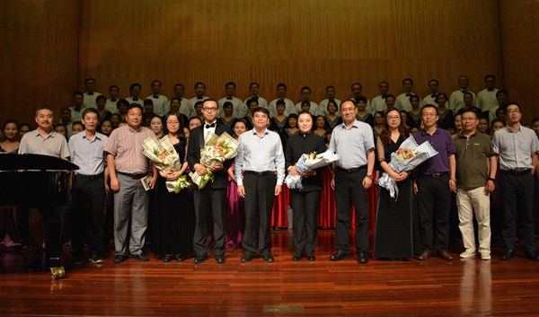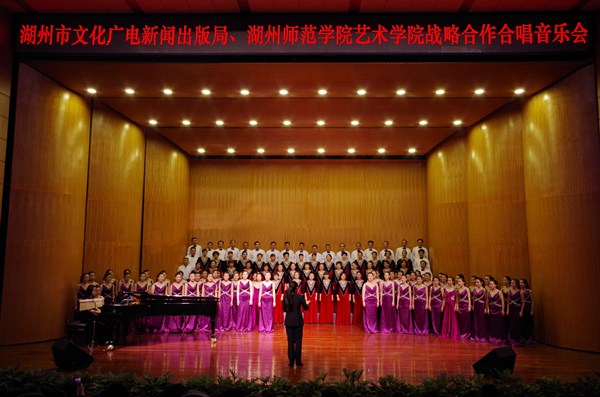 当天晚上,在我校音乐厅上演了一场市文广新局—湖州师院艺术学院战略合作合唱音乐会。本场音乐会由湖州城市合唱团与我校女子合唱团共同演绎,以美妙的歌声为双方合作拉开了序幕。校长张立钦,湖州市文化广电新闻出版局党委书记、局长宋捷出席。