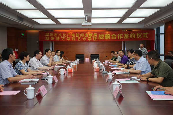 6月16日,我校举行湖州市文化广电新闻出版局、湖州师范学院艺术学院战略合作签约仪式。湖州市人民政府副市长闵云,校党委书记刘剑虹,党委副书记杨柳,湖州市文化广电新闻出版局党委书记、局长宋捷,校党委委员、宣传部长何小青,湖州市文化广电新闻出版局党委委员、纪检组长柏建华等出席,湖州市文化广电新闻出版局相关部门负责人和各文化单位代表、艺术学院相关负责人和教师代表参加了会议。