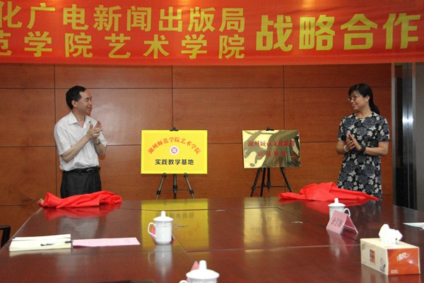 会上,闵云与刘剑虹共同为“湖州市城市文化联盟”和“湖州师范学院艺术学院实践教学基地”揭牌;湖州市文广新局与艺术学院代表签订合作协议。