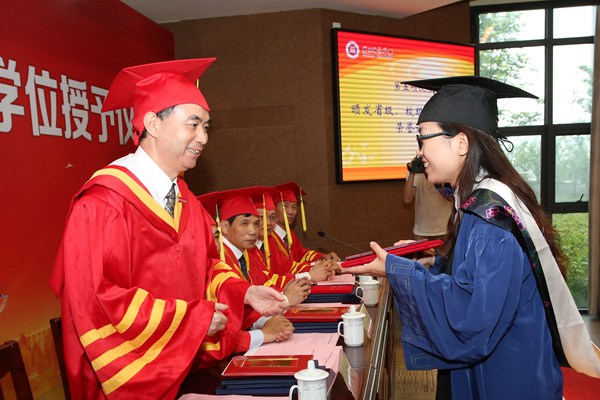 与会校领导共同为全体毕业研究生颁发毕业证书、学位证书,并行拨穗礼。