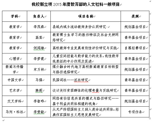 日前,教育部正式公布2015年度教育部人文社会科学研究一般项目立项结果,我校共立项9项,其中规划项目3项,青年项目4项,自筹项目1项,专项任务项目1项。