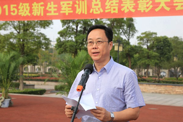 9月26日上午,我校隆重举行2015级新生军训总结表彰大会。校长张立钦、党委副书记杨柳、副校长蒋云良、2015级新生军训团团长严红辉出席,校军训领导小组成员、承训教官、指导员和2015级全体参训同学参加了总结表彰会。表彰会由蒋云良主持。