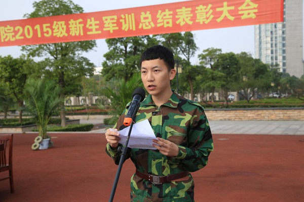 2015级新生军训代表朱智凡上台发表军训感言,号召同学们把军训期间培养的顽强拼搏的作风、团结协作的精神、严明的纪律和良好的行为习惯,带到大学的学习和生活中去,争做一名新时代的翩翩君子,争做一名新时代的优秀大学生。