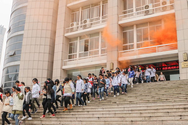 14点整,随着沈建民宣布“演练开始!”的指令,“火险”突然在图书馆三楼内“蔓延”开来。随着数团浓烟渐渐弥漫在了以西校区图书馆和中、西校区1-21幢宿舍幢宿舍为中心的西校区当空,五千多名在图书馆、宿舍区域待命的师生开始进行“火场逃离”。第一现场的学生拨打“校园110”、“火警119”和“急救120”、就近取灭火器灭火、下楼通知相关值班人员、告知本层以及相邻楼层同学情况,并在相应引导员的组织下有序向室外疏散。消防控制室值班人员接到报警后,迅速进行电源强切、将火灾报警联动开关转入自动状态、拨打“火警119”、启动排烟送风等联动设备、通过消防广播通知人员进行疏散。随后,迅速赶来的消防队在学校保卫人员的通力协作下,利用云梯、绳索、缓降器等工具救下了图书馆内“被困”的全体人员。