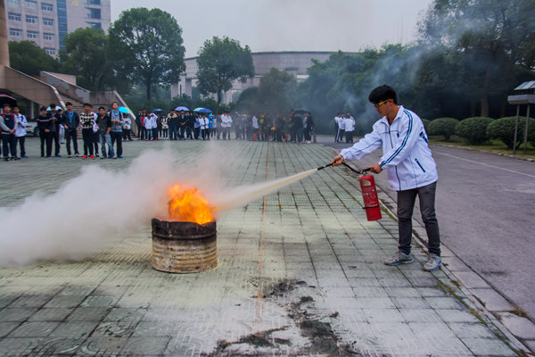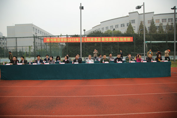 在全国第25个“11•9”消防宣传活动日到来之际,11月4日,我校在图书馆及中西校区学生公寓区域举办2015年灭火和应急疏散预案演练活动。副校长沈建民、湖州消防支队副政委孙永其、湖州市人防办副主任白和明、湖州市红十字会办公室主任朱培兰、湖州市急救中心副主任林菊华、龙泉派出所所长张震凯等出席,党校办、宣传部、教务处、学生处、保卫处、资产与后勤管理处、团委、后勤服务总公司等部门和相关学院负责人共同观摩了演练。演练由沈建民担任总指挥。