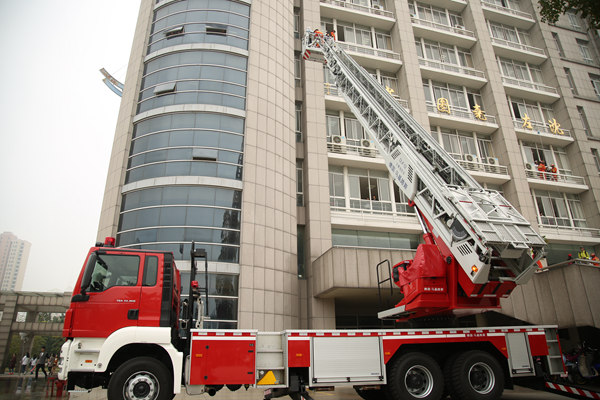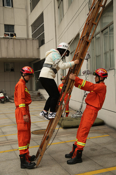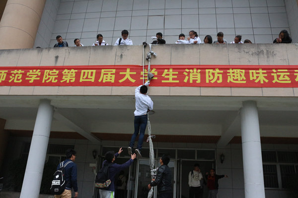 不到10分钟,5280多名参演师生全部安全有序地按照既定路线有序疏散到西校区足球场避险。在模拟被困的学生中,云梯救援4人、缓降器救援8人、拉梯搭救8人、床单结绳自救5人,4名模拟受伤人员被消防队员成功救出,并接受医务人员的救护。