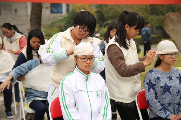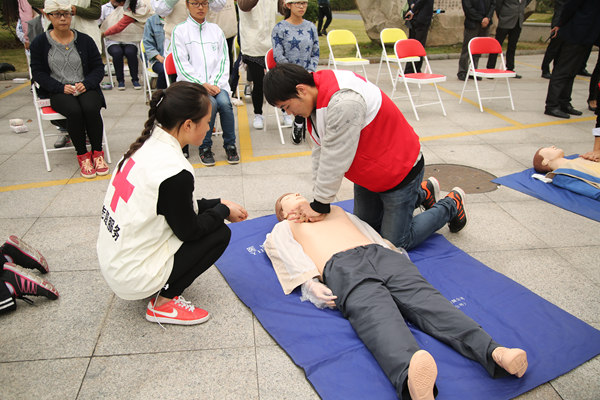 除了疏散演练,现场还同步进行了应急救护展示。30名志愿者按照检伤分类的原则分别坐在红、黄、绿色的椅子上, 30名初级救护员分别对志愿者头部、肩部、胳膊、手掌、膝盖等部位进行了“8”字、回返式、大悬臂带、三角巾带式等包扎操作。另有10名初级救护员对五具模型进行了CPR操作,他们娴熟的手法给观摩者留下深刻的印象。疏散结束后,保卫处负责人对本次活动进行了点评。