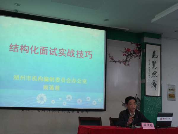本次讲座邀请了吴兴区教育局副局长周晓凤和湖州市机构编制委员会办公室副主任顾蔼慈为毕业生做招考形势分析及结构化面试技巧辅导。周晓凤对湖州教师招聘政策和湖州市本级学校师资配备现状及需求数量与学科分布等方面做了详细的介绍,顾蔼慈结合历年教育招考面试实战情况,就面试题目类型,答题技巧等方面做了全面的讲解及应试辅导。