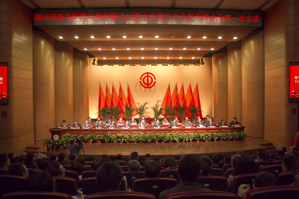 在学校深入学习贯彻党的十八大、十八届三中、四中、五中全会和习近平总书记系列重要讲话精神的形势下,在全校师生员工满怀豪情为贯彻落实第三次党代会精神的大背景下,11月20日下午,我校隆重召开五届一次教职工暨工会会员代表大会。大会在庄严的国歌声中开幕,共有185名正式代表、11名列席代表以及7名特邀嘉宾参加会议。浙江省教育工会主席赵祖地、浙江省教育工会宣教部部长郑卫芳、湖州市教育工会副主席邓伟雄应邀出席会议。“双代会”主席团全体成员在大会主席台就坐。会议由校党委副书记黄建平主持。