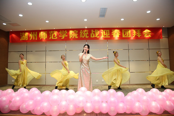 团拜会文艺演出在一曲大气磅礴的《中国梦》中拉开帷幕,充分展示了师院人奋发向上的精神面貌;歌伴舞《节日欢歌》唱出了人们心中的幸福追求,舞出了生活的喜庆吉祥;清脆婉转的琵琶独奏《送我一枝玫瑰花》,使人仿佛置身于浪漫的玫瑰园中;男声独唱《一个妈妈的女儿》表达了全国各族人民团结和谐的美好情谊和对祖国母亲的深深爱恋;配乐诗朗诵《朗诵者之歌》,尽显历史的沧桑与岁月的变迁;一首《橄榄树》点亮了我们心中对生命的感悟和年少懵懂时的希冀;纯英文独唱《Right Here Waiting》让大家感受到了爱情的美好与责任,表达了对爱情的美好向往;葫芦丝独奏《月光下的凤尾竹》带领我们领略了中国古典音乐柔美、典雅的艺术魅力;《一杯美酒》,如同一首长篇抒情诗,尽显新疆风情的独特韵味,赢得了观众阵阵掌声;舞蹈《喜水》,跳出了水乡儿女对水的喜爱、依赖和敬畏,舞出了师生齐心协力积极参与五水共治的激情;相声《笑谈湖州》,嬉笑间让我们更加热爱湖州、热爱生活;最后,团拜会在激情昂扬的女高音独唱《共筑中国梦》中画上了圆满的句号,共祝师院更美好,祖国更繁荣!