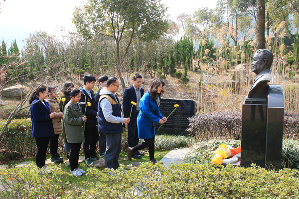 来访期间,沈龙一行还在相关职能部门和二级学院师生代表的陪同下,前往枫树岭生态陵园祭拜沈左尧先生。大家怀着无限哀思向沈老三鞠躬并进献鲜花。师生代表们深切缅怀沈老,表示将认真学习践行沈左尧先生崇高的爱国主义精神,锲而不舍、坚忍不拔的执着追求,健康向上、积极乐观的人生态度,和甘于奉献、回报社会的崇高品格。
