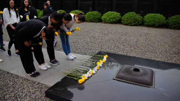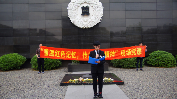 南京大屠杀纪念馆是此行的第二站。学生党员在认真参观了纪念馆后,在祭场开展了一场别开生面的宣讲和悼念亡魂的祭奠活动。程星珍、金蜜蜜讲述了和平年代大学生应该如何爱国,陈思瑶则结合个人感悟提醒同学们要时刻警醒,不忘沉痛历史,奋发图强。学生党员慷慨激昂的宣讲吸引了在场参观的很多人,还有一些来自英国的外国友人也为学生热情的鼓掌。