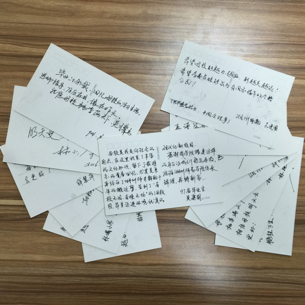 活动第二部分,为留住一段历史,传递一种情感,志愿者们将“湖小狮”玩偶、徽章和签字笔赠送给林城小学的湖师校友,并邀请15位校友老师在明信片上写下寄语,祝贺母校百年校庆诞辰。97届湖师毕业生现任长兴县林城小学党委书记、校长吴建国深情地写到:“母校是我走向社会的起点,在这里积累了丰富的文化知识,留下了最难忘的青春回忆,尤其是亲身经历了湖州师专期盼十年的搬迁梦,告别了‘有校无园、有操无场’的旧校园,昂首迈进环境优美的现代化新校园。感谢商学院搭建这样的平台让我们感念母校,祝福湖州师范学院传承辉煌,再铸新高。”