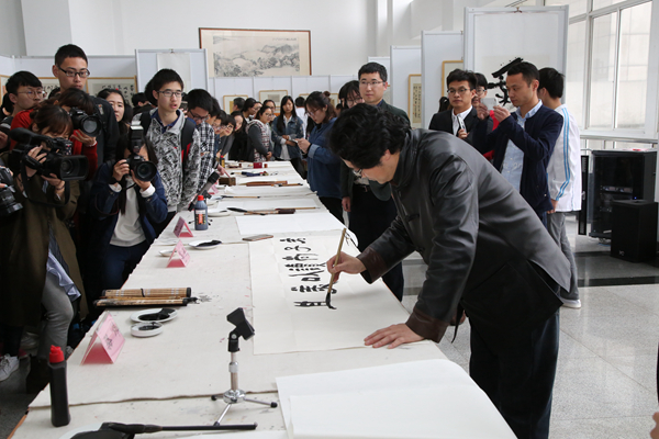 开幕式后,嘉宾和师生们来到图书馆大厅欣赏艺术学院范斌教授与校友的书法秀。范斌教授在现场挥毫泼墨,气定神闲地写下八个大字 “君子尚读 以美其身”。校友骆炜、王忠、朱茂芝、柯用叨、张怀也展示了自己的书法才艺。其中一个女孩吸引了大家的注意,她叫苑丹青,2007年毕业于我校,师从范斌教授,用功于秦汉玉印,书法主攻褚遂良雁塔圣教序,多次获得篆刻和书法奖。她与师父范斌一左一右、一师一徒,让现场观众看到了传承与发扬,也激起了师生们对书法的热情。