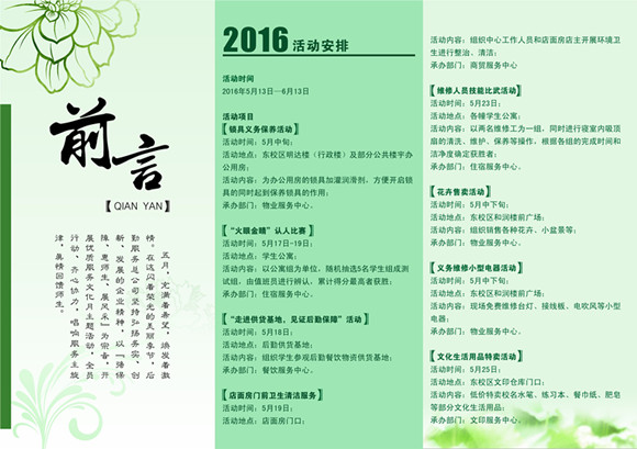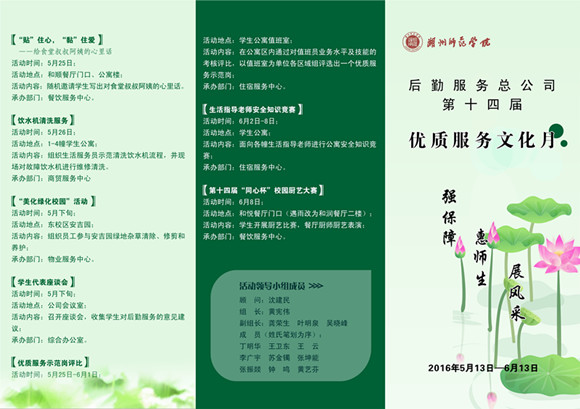 本届优质服务文化月,总公司在总结前十三届的经验基础之上,将紧紧围绕“强保障、惠师生、展风采”开展系列活动。内容丰富多彩,有优惠让利、倾听心声、义务服务、竞赛练兵、走进后勤等十余项不同类型的活动。