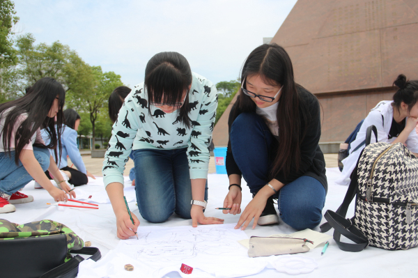 同学们在领到的白T恤上,展开了自己无穷的想象力,兴致勃勃地挥洒着手中的画笔。尽管五月中旬的正午气温挺高,阳光炽热,但是参赛的同学都积极地参与其中。有的同学绘制了表达感恩父母的作品,一老一少相互扶持、回眸微笑;有的同学绘制了感恩友情的作品,掌心相对,共筑友谊之桥。一件件特别的T恤,五颜六色的颜料,诉说着同学们的感恩之情。
