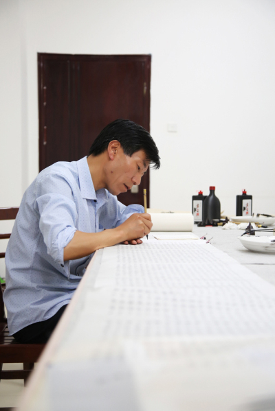 对于党章,王海华一直心存敬重,坚持以身作则,发挥先锋模范作用,提高党性觉悟,抓好党建工作。恰逢“两学一做”学习教育这一契机,作为书法家的他做了一个大胆的决定——在绢上抄写党章,这也是他的首创,因为在绢上抄写党章不仅要有书法基础,还需要一气呵成,不能出现失误,否则就要重头再来。