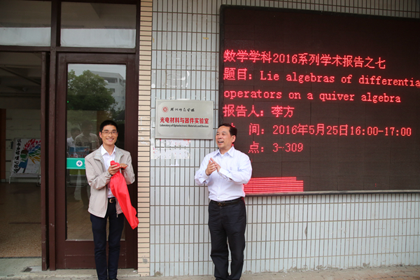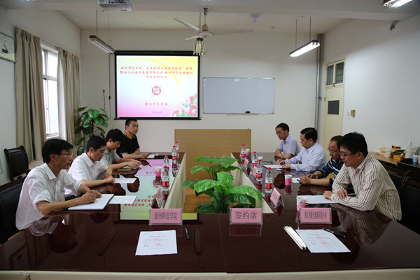 理学院院长介绍了学院、物理学科以及物理实验中心的情况。叶金云和俞百兴分别代表双方签署了合作协议,并共同为光电材料与器件实验室揭牌。