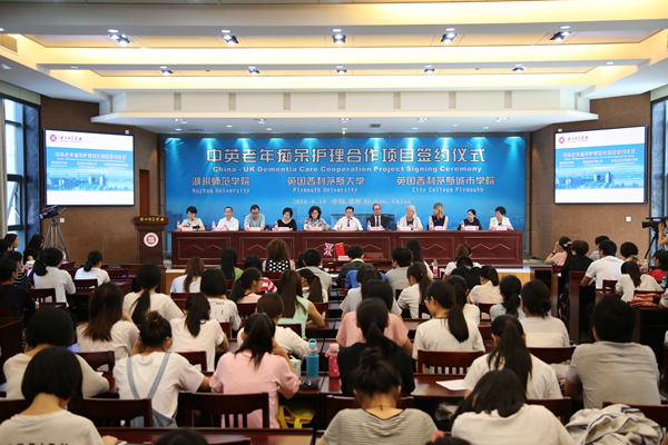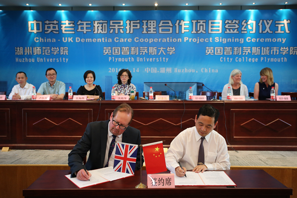 6月14日上午,中英“老年痴呆护理”合作项目签约仪式在我校隆重举行。英国普利茅斯城市学院校长Phil Davis、英国项目专家组代表Val Manne、湖州市卫生与计划生育局副局长沈霞萍、英国驻中国大使馆文化教育处官员王海燕、我校副校长叶金云等出席,湖州市护理学会、附属第一医院、湖州市第三人民医院、医学院/护理学院、外事处等单位师生代表共200余人参加签约仪式。