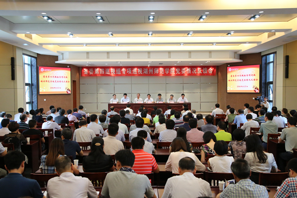 经省委同意,省委第四巡视组向湖州师范学院党委反馈专项巡视情况。2016年6月21日,省委第四巡视组组长龚吟怡向湖州师范学院党委书记刘剑虹反馈了巡视情况,省委巡视工作领导小组办公室副主任邱志明传达了省委书记夏宝龙关于巡视工作讲话精神;之后,龚吟怡代表巡视组向湖州师范学院党委领导班子进行了反馈,邱志明、省委教育工委委员、省教育厅副厅长丁天乐和湖州市委常委、纪委书记陈浩对落实巡视反馈意见的整改工作分别提出要求,刘剑虹同志主持会议并作了表态发言。