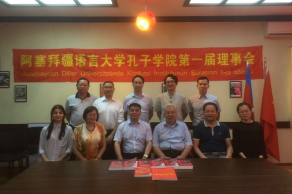 6月24日,我校与阿塞拜疆语言大学合作举办的孔子学院揭牌仪式在阿塞拜疆首都巴库隆重举行,中国驻阿塞拜疆大使馆官员李劲松先生和汤中超先生,中国国家汉办、孔子学院总部亚非孔子学院处处长邵旭波和项目官员李婵,阿塞拜疆外交部全权特使大使古尔巴诺夫·法赫拉丁先生,外交部亚洲司司长侯赛因诺夫·侯赛因先生,我校校长张立钦、阿塞拜疆语言大学校长敦亚明·尤努索夫出席,中国在阿塞拜疆的工商界人士和两校师生代表等参加了揭牌仪式。