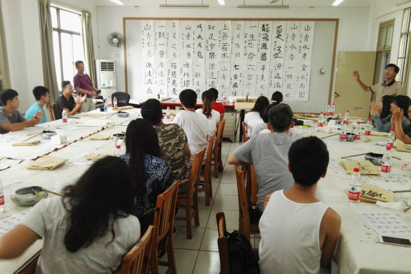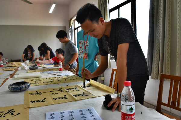 12日下午,夏令营全体学员到访我校接受书法培训。我校王海华老师给夏令营学员上了一堂生动的书法课。课堂上,既有师生教学互动,又有书法实践。每位学员都认真完成了自己的书法作品,王老师还和学员们一起对全部作品进行了评析。学员们表示受益匪浅,并纷纷将自己的作品带回。期间,台湾大学生还和我校学生进行了交流。