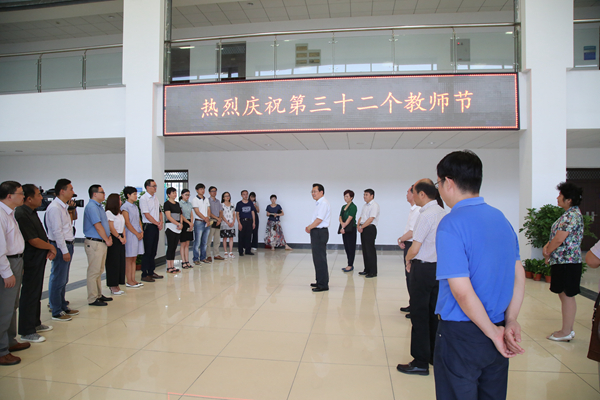 在全国第32个教师节来临之际,湖州市委书记裘东耀,市委常委、宣传部长胡菁菁,市委常委、秘书长高屹和副市长闵云一行来我校,亲切慰问广大教师。校党委书记刘剑虹,校长张立钦,党委副书记黄建平、蒋云良,副校长陆永良陪同慰问,学校高层次人才,校“陆增镛教师奖”获得者,2016新进教师等代表参加慰问仪式。