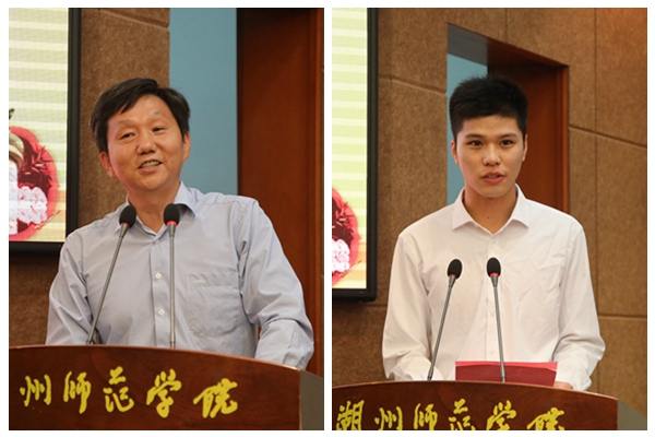 商学院国际经济与贸易专业、校学生会主席张旭涛作为学生代表发言,感谢老师教会他知识真理和待人接物的处世哲学,并表示在未来的日子里,将坚定不移地践行社会主义核心价值观,弘扬爱国、敬业、诚信、友善的精神,将湖师学子的优良品质发扬光大。