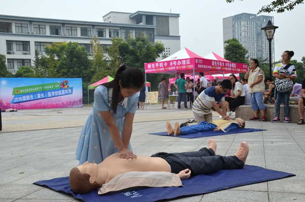 为揭开医学神秘的“面纱”,让新生提前接触、了解、体验医学专业技能,培养其职业兴趣,帮助家长了解孩子在校所学所获,学院在誓言广场开展了“湖州师范学院纪念第17个世界急救日,2016级新生(家长)医学技能嘉年华”主题活动。活动现场,护理协会、新医协会、口腔协会、歧黄社和阳光医疗服务团结合本专业特色,通过讲解、答疑和现场演示等方式,为新生和家长开展医学技能普及教育。广场上摆放的4具仿真人体模型成为焦点,新生和家长在应急救护讲师的帮助下,好奇地尝试了心肺复苏术。“以前就是在电视上看见过医生做这个,自己动手试了试,发现心肺复苏术还真是不简单,力度和频率要掌握的很好,才能实际去救人,刚刚这个模型我就没有急救成功。”一位家长这样说道。