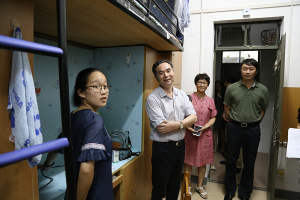 领导们每走进一间寝室都耐心细致地和同学们沟通交流,亲切地询问同学们“你们都是来自哪里?”“刚到学校食堂饭菜能适应吗?”通过认真听取同学们的心声,拉近了与同学们的距离。“我的家乡在新疆阿克苏,我一个人坐了40多个小时的火车来到学校,校领导亲自来宿舍看我们,我很惊喜,他亲切地和我们交谈让我排解了舟车劳碌的疲倦,也让我感到了家的温暖。”来自新疆身高1米9的教师教育学院应用心理学专业柳杨同学说。