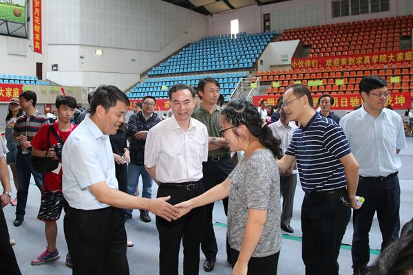 上午 9 时,湖州师范学院党委书记刘剑虹,湖州师范学院校长、求真学院董事长张立钦,湖州师范学院党委书记副书记蒋云良,湖州师范学院副校长马志和,在求真学院领导班子以及学校相关部门负责人的陪同下,来到新生报到接待点,详细了解新生报到情况,并对辛勤工作在一线的工作人员进行慰问。