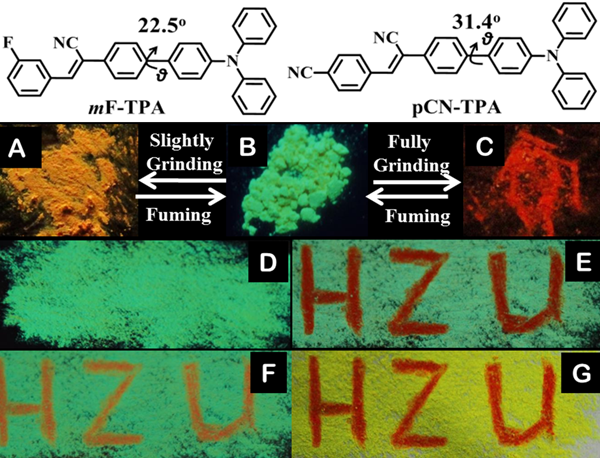 据悉,在此之前,张玉建博士基于HLCT激发态的理念,设计的分子内电荷转移化合物pCN-TPA,在机械力研磨下,绿色粉末逐步变色红色,产生121 nm的红移。在国际上,首次提出在机械力刺激下能进行两种激发态(LE-CT)之间的切换。如图所示,将荧光分子平铺在滤纸上,指甲轻轻滑动,划过的痕迹荧光发生改变,写下字母HZU(湖州大学,Huzhou University, 英文缩写),该成果发表在Chem. Eur. J. 2015, 21, 2474 – 2479。后来,这一成果被香港科技大学唐本忠院士,日本科学家Takashi Kato,北京大学贾欣茹教授,吉林大学张红雨教授,中山大学许家瑞教授在Chem. Rev., Adv. Mater. ChemPhysChem, 和ACS Symposium Series等综述或者专著上对该工作进行详细的报道和评论,引用次数达40次。除此之外,该论文被Web of Science列为2015-2016年度的高被引用论文(ESI),近三年该方向已经有四篇论文入选ESI论文。该项工作得到了国家自然科学基金(51403060, 91227202)和浙江省自然科学基金(LY15E030002,LY16E030011)的支持。