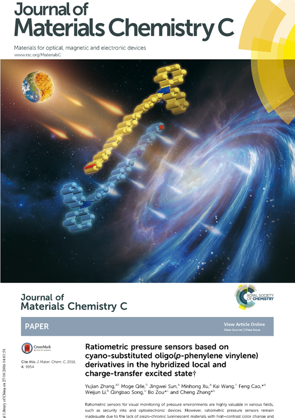 近日,工学院张玉建博士作为第一作者,曹枫教授作为通讯作者的学术论文“Ratiometric pressure sensors based on cyano-substituted oligo(p-phenylenevinylene) derivatives in the hybridized local and charge-transfer excited state”以封面文章(Front Cover) 的形式发表在国际著名材料化学类期刊J. Mater. Chem. C, 2016, 4, 9954--9960上。
