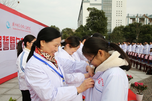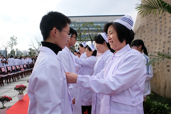 仪式上,来自第一临床医学院、浙北临床医学院和浙江省皮肤病防治研究所的临床一线德高望重的医生和护士,医学院教师代表为619位新生授予白衣。在庄严的音乐声中,前辈们为新生系纽扣、正衣冠,赠送医学生誓言卡,对学子提出了殷切期盼。学生代表给30位医学界前辈送上鲜花,表达感谢之情。