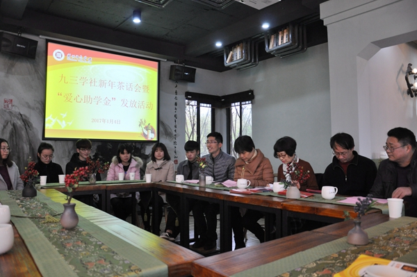 1月4日下午,九三学社新年慰问会暨“爱心助学金”发放活动在我校从游居举行。九三学社湖州市委员会专职副主委陈洁、九三学社湖州市委员会副主委朱建方、九三学社湖州市委员会办公室主任朱辉,校统战部、学生处负责人,校学生资助中心工作人员,九三学社湖州师范学院委员会社员代表以及全体受助学生参加了活动。