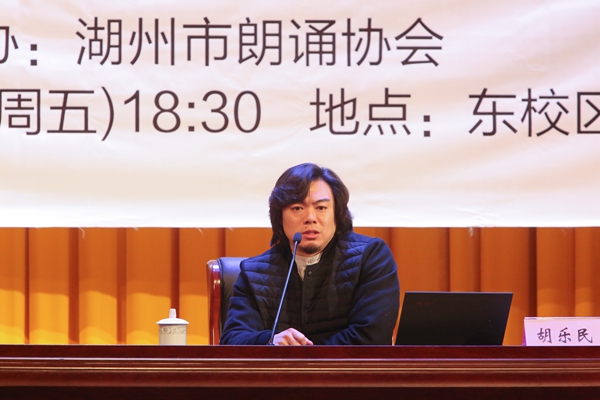 古人云:“腹有诗书气自华。”为了更好地提升语言表达的能力,传播语言文化的魅力,胡老师播放了自己在“纪念世界读书日——‘情满中华’胡乐民经典作品演诵会”上表演的现代诗作品《在欢呼人群中》,并为大家现场演绎了《木兰辞》。互动环节中,胡老师还与两名朗诵爱好者就《满江红》进行了现场指导,随后用滂湃的情感和极富感染力的肢体语言表演了自己创作的《满江红》。当听众提问胡老师的演诵究竟是表演的成分多还是朗诵的成分多,“演诵最多的不是表演和朗诵,而是情感。一个好的作品应该80%是感情,其余的才是表现的技巧。”胡老师的回答赢得了现场热烈的掌声。