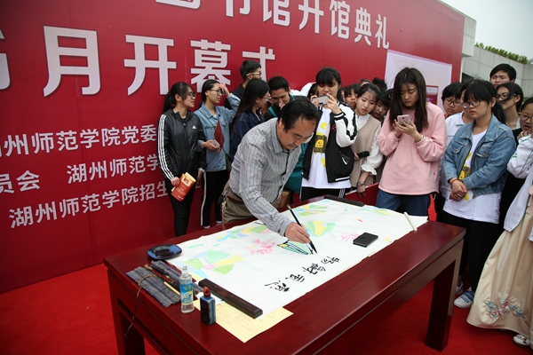 活动开幕式结束后,师生们还一同观摩了我校图书馆驻馆艺术家陈湘教授现场泼墨作画“惠风和畅”。陈教授打破传统方式,以独特视角,以国画的线条,鲜艳的色彩,新颖的造型诠释了“惠风和畅”的内涵。据悉,这幅带着美好吉祥寓意的作品完成后将入驻东校区图书馆。