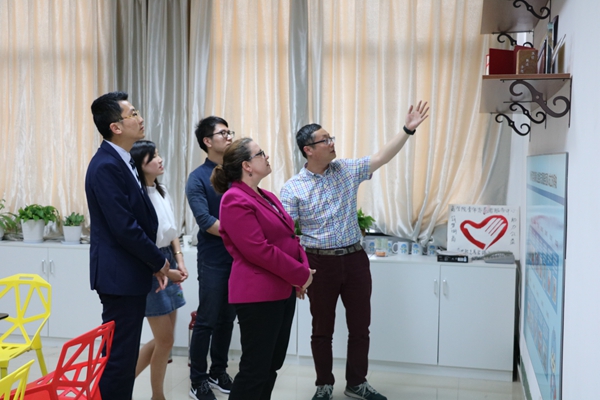 座谈会结束之后,费曼舒女士一行还参观了志愿者学堂。费女士对以自闭症儿童画作为素材加工制作的石头画、玻璃画、手机壳等精美工艺品赞不绝口,对商学院发挥专业优势开办学堂、公益创业给予充分肯定,并表示会持续关注这支团队未来的发展,希望中美两国的公益组织能一起合作共同关爱这群来自“星星的孩子”。