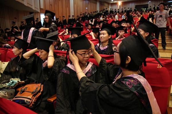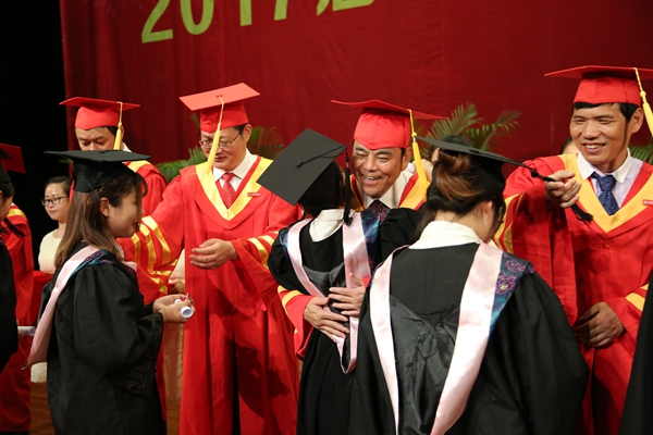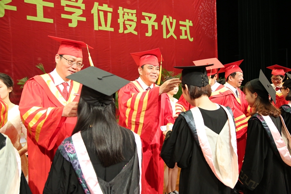 6月15日下午,2017届毕业生学士学位授予仪式在东校区大会堂举行。校领导班子成员、教授代表为获得学士学位的学生正冠拨苏、颁发学位证书并合影留念。据悉,今年我校共为4114人授予学士学位,其中师院本部2361人,求真学院1753人。