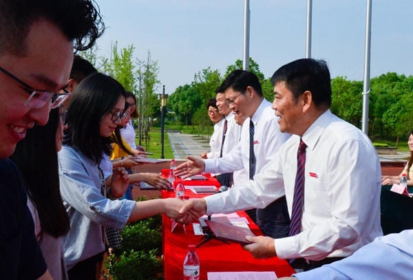典礼上,校领导为省级优秀毕业生代表颁发荣誉证书,为毕业生代表颁发毕业证书。