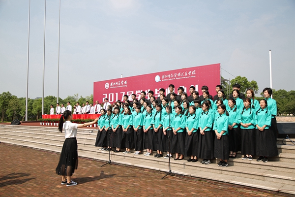 毕业了,舍不去的同学情,割不断的师生谊,毕业生代表为恩师们献花并深情拥抱。校中华诗词朗诵大赛优秀选手代表为大家带来诗朗诵《再别师院》,为即将走出校园的学长学姐们送上祝福。毕业典礼在全体师生合唱校歌中温情结束。