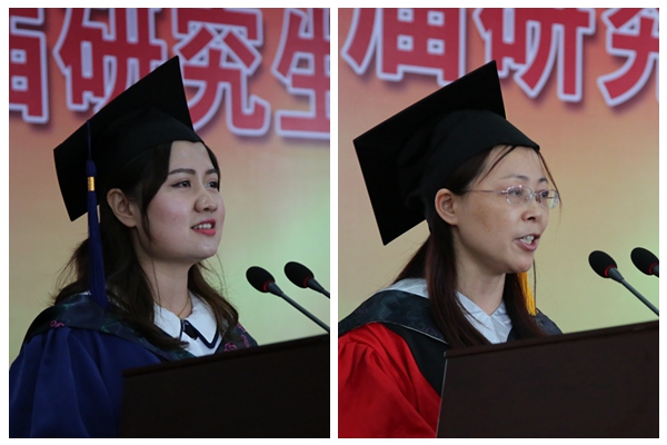 毕业生代表谭星同学以感恩之心畅谈研究生生涯的点滴,感恩老师,感恩父母,感恩学校,感恩自己,并承诺以师院人的身份为医疗护理事业增添力量,为全人类的健康造福。