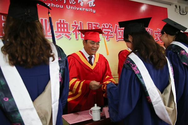 33名身着学位服的硕士毕业生接受校领导为自己正冠拨穗、颁发学位证书。